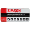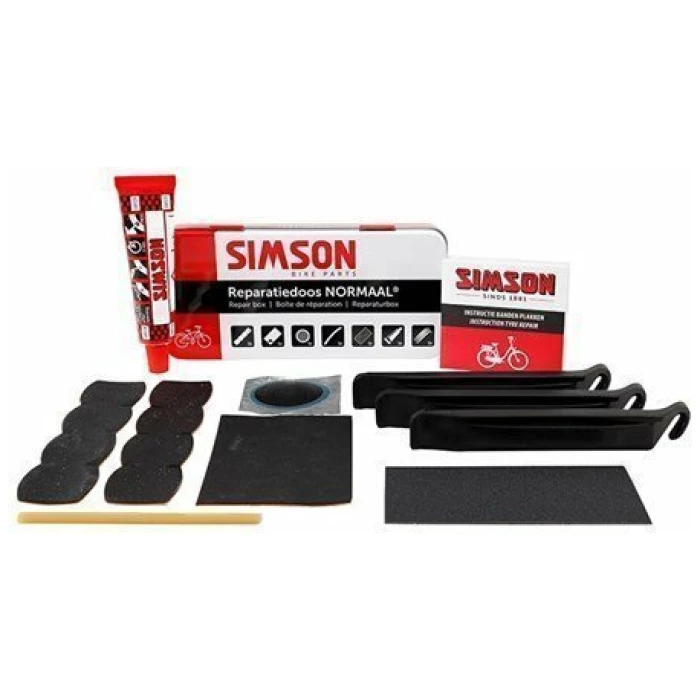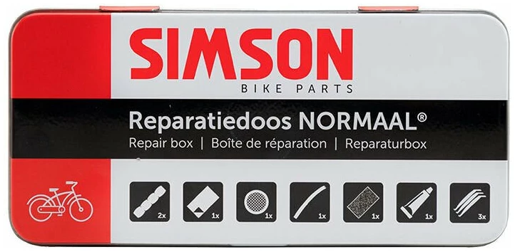 De enige echte originele Simson Reparatiedoos Normaal. Deze reparatiedoos is handig voor het repareren van vrijwel iedere traditionele fietsband zowel thuis als onderweg. Volg bij het plakken van de band de bijgeleverde instructies. De inhoud van de Simson Reparatiedoos Normaal is goed voor 12 plakbeurten en bestaat uit: 2 x vierstrip pleister, 1 x knippleister, 1 x waterproof schuurpapier, 1 x buitenbandplakker 35 mm, 1 x ventielslang, 1 x tube solutie 10 ml, 3 x bandenlichter. De meegeleverde bandenlichters zijn sinds november 2019 van kunststof (voorheen waren deze van metaal).